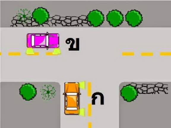 10.14 ในทางร่วมทางแยกที่ไม่มีสัญญาณไฟ ถ้าขับรถมาถึงพร้อมกัน รถคันใดมีสิทธิ์ขับผ่านไปได้ก่อน